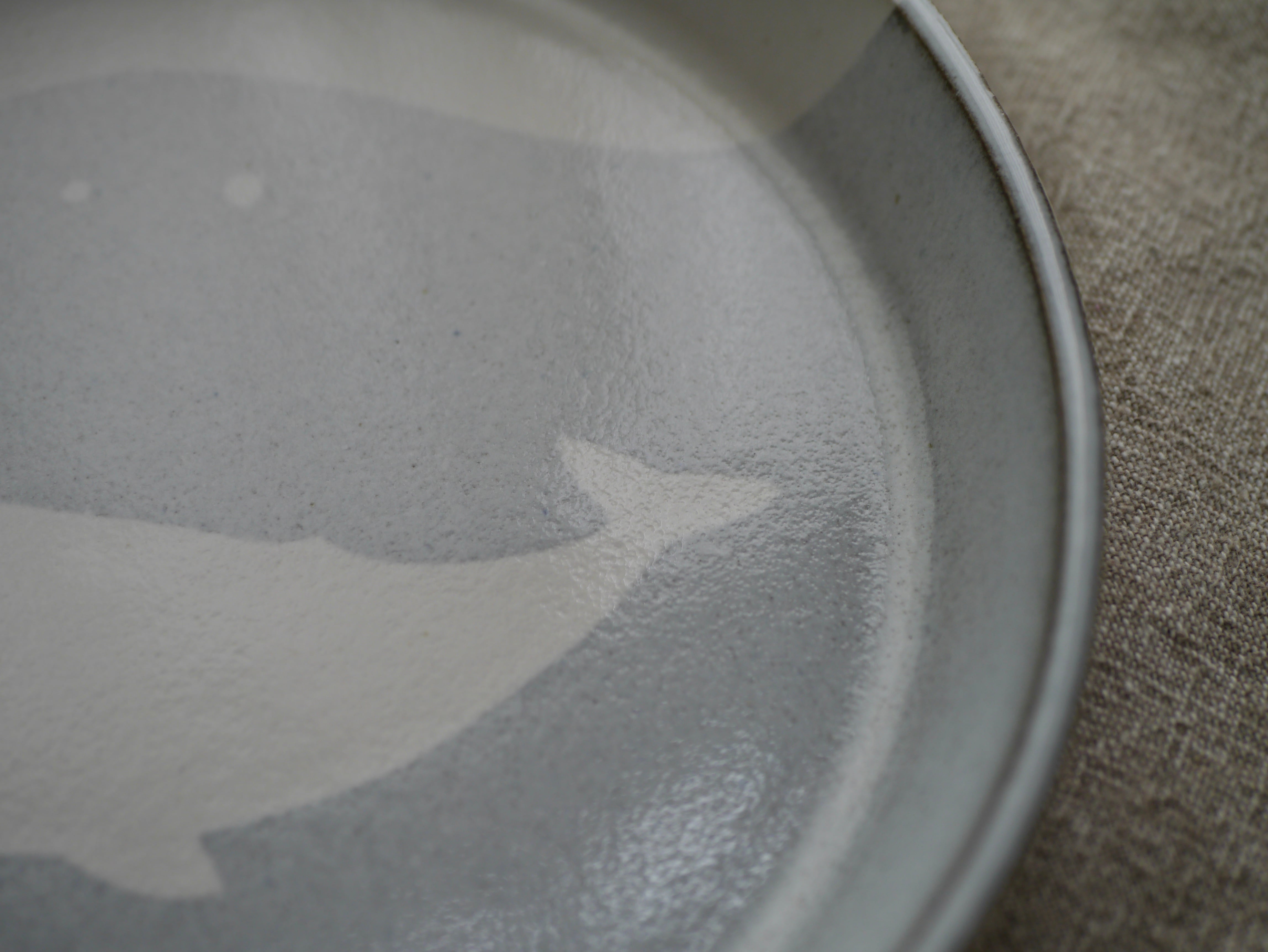 海の中をのんびり泳ぐくじらが描かれた丸いプレートです。