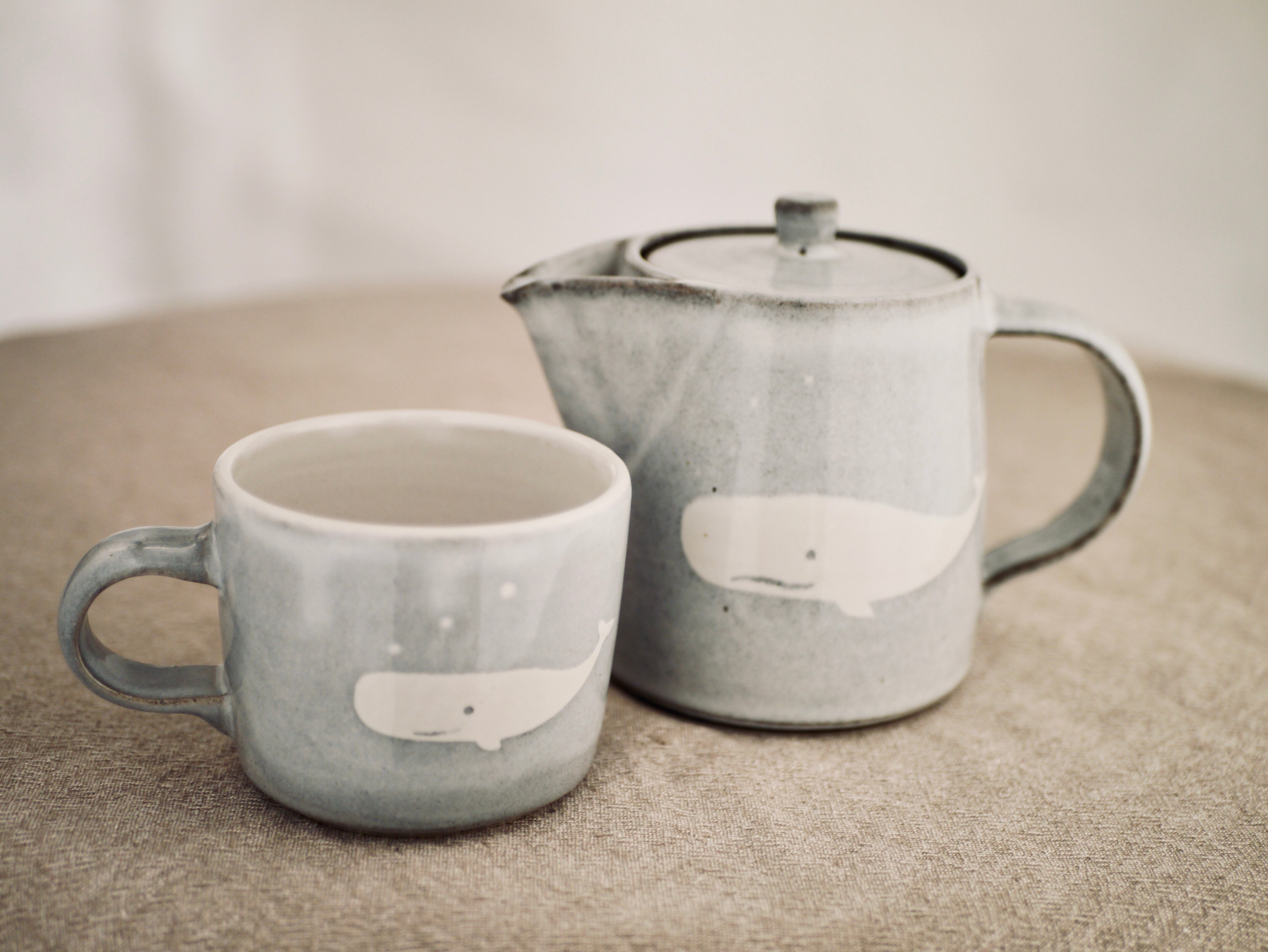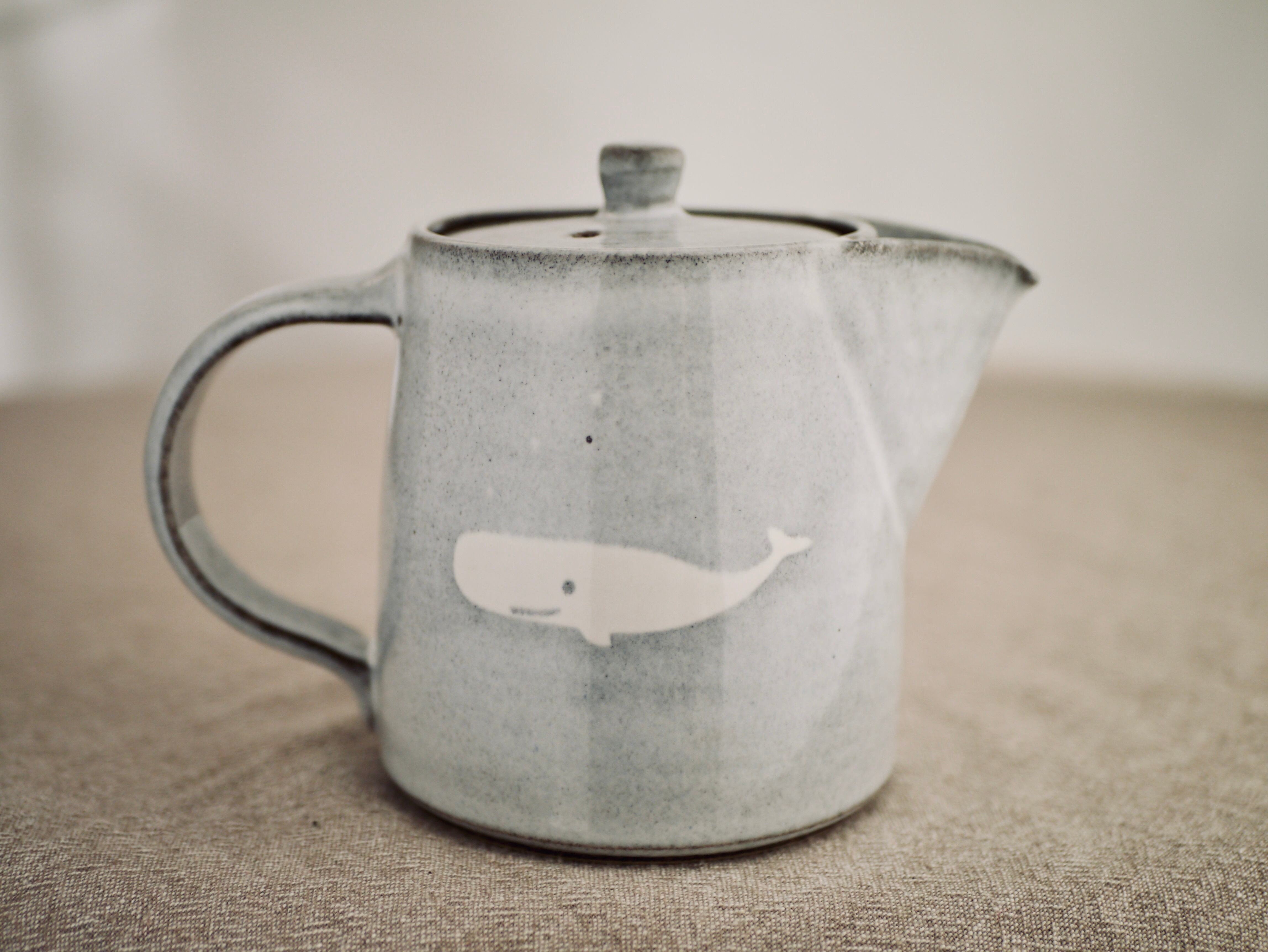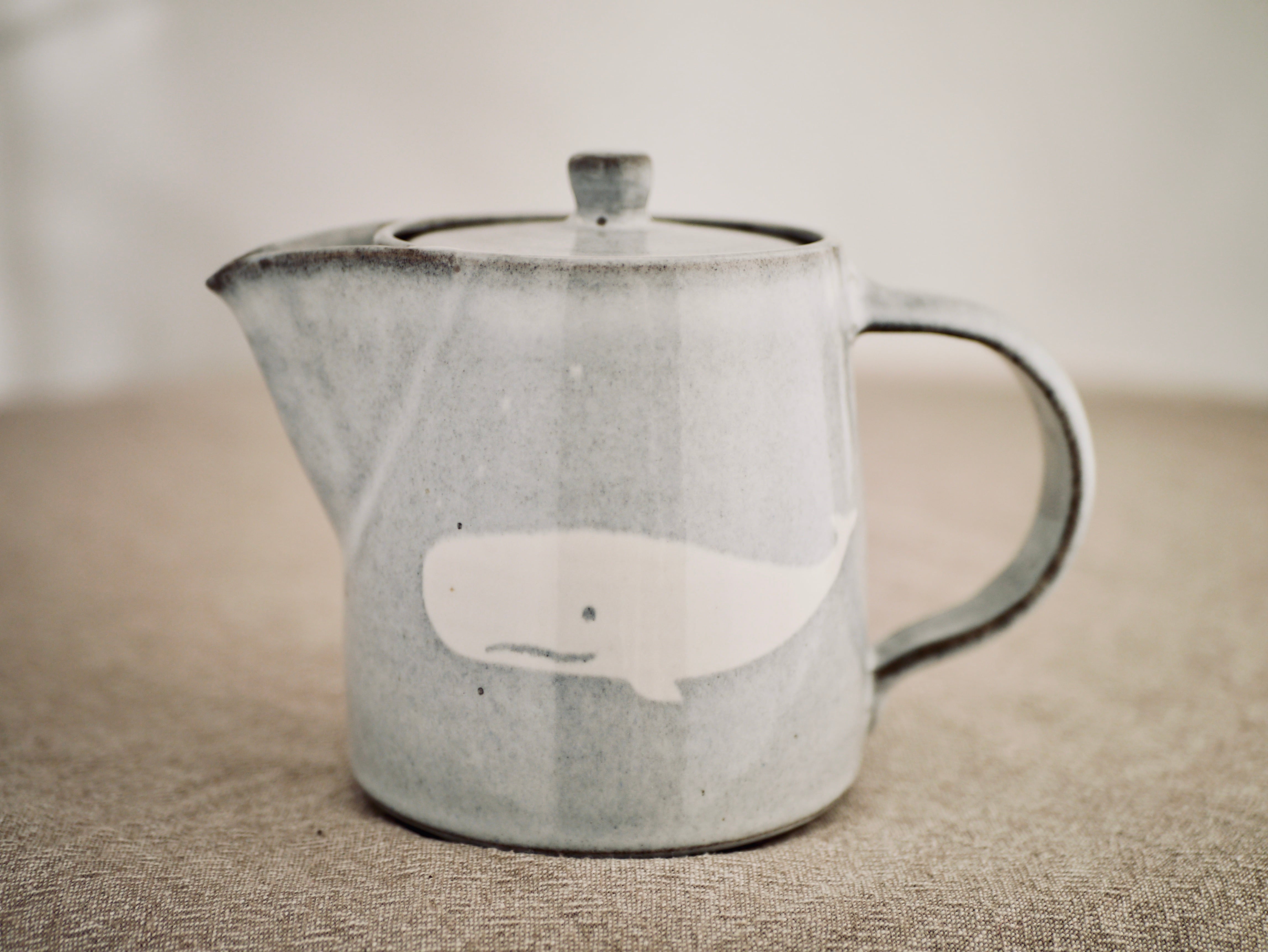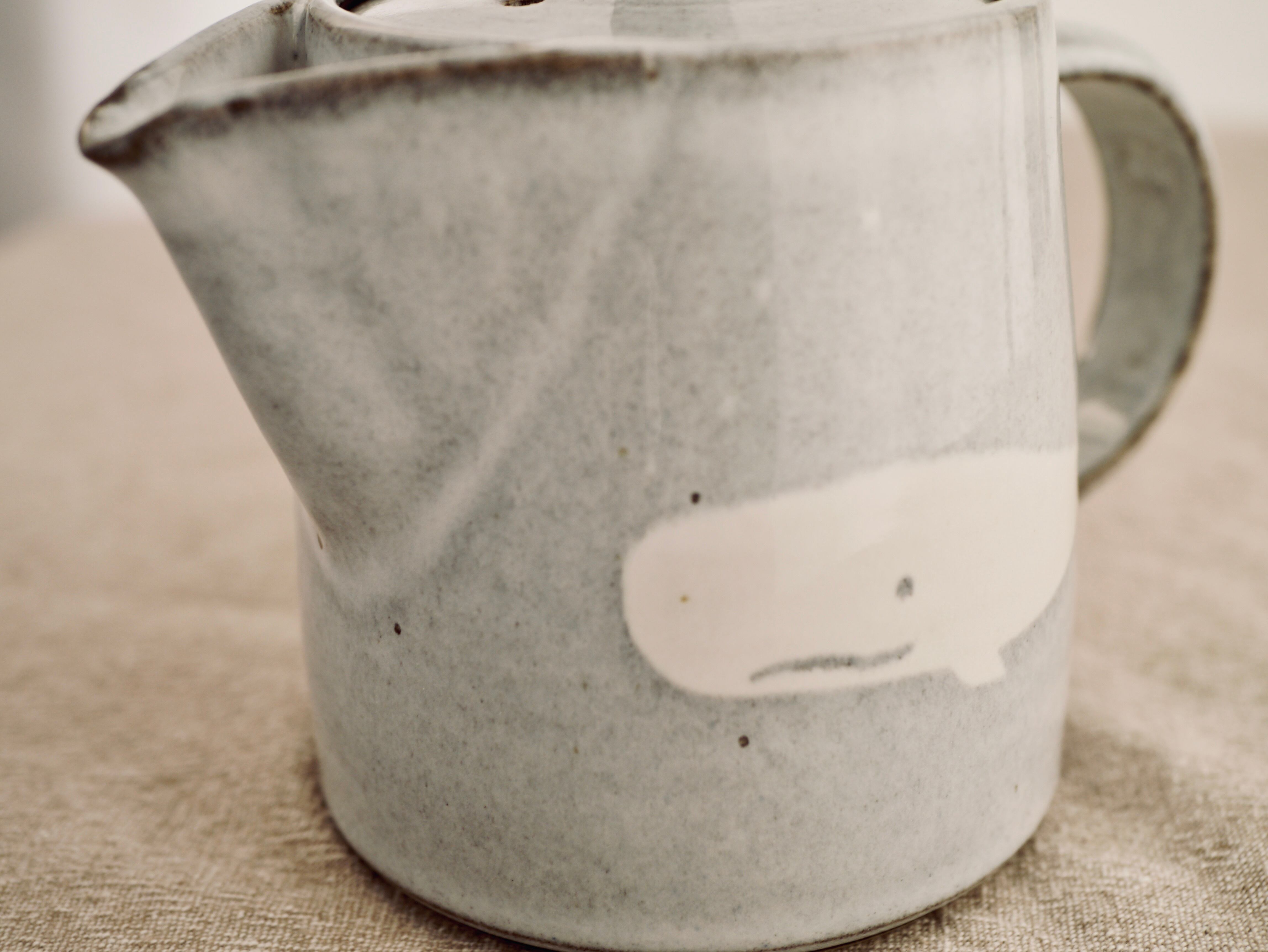 海の中をゆったりと泳ぐくじらが描かれた、シンプルで愛らしい寸胴型のコーヒーポットです。